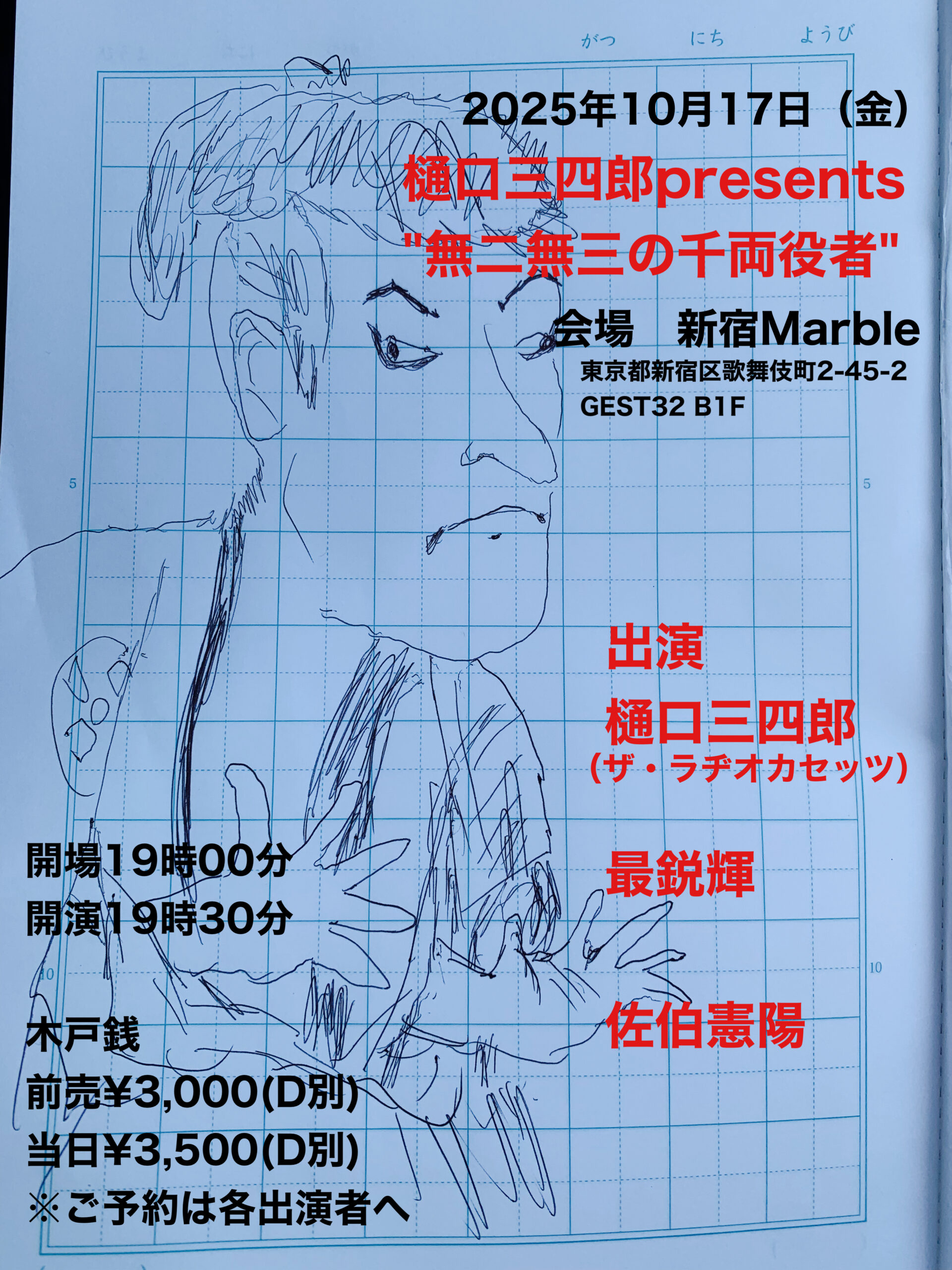 LIVE 2025年10月17日(金) 樋口三四郎presents無二無三の千両役者 2025/10/17(金)新宿Marble 樋口三四郎pre「無二無三の千両役者」 出演 樋口三四郎(ザ・ラヂオカセッツ) 最鋭輝 佐伯憲陽 OPEN 19:00 / START 19:30 前売¥3,000(D別) / 当日¥3,500(D別) ※チケット予約はこちら ツイート
